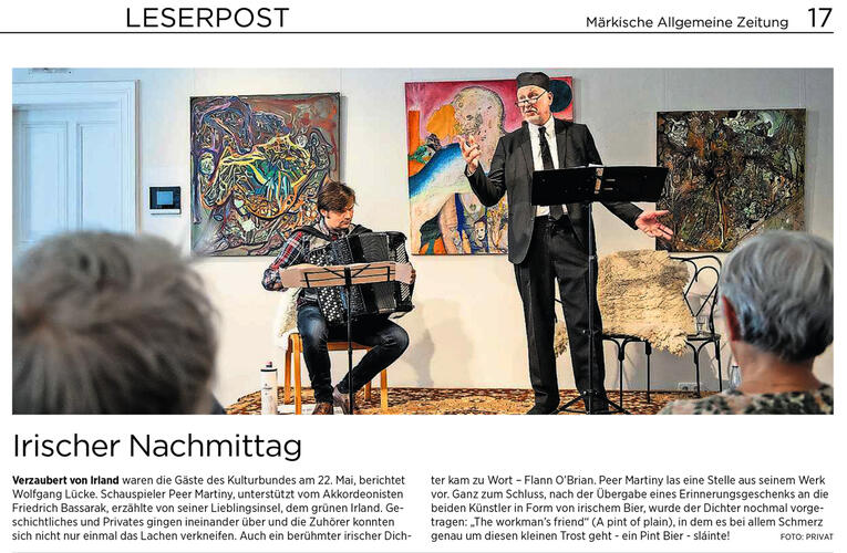 Nach vierzig Jahren Leben und inniger Verbundenheit mit der irischen Insel kommt endlich Peer Martiny's Reise- und Freundschaftsbericht auf die Bühne.Peer Martiny, Schauspieler und Regisseur (bekannt u.a. aus Doppelhaushälfte, Tatortreiniger), mit langer Beziehung zum irischen Volk, gießt seine Erfahrungen und Erlebnisse, aus mehr als vierzig Jahren mit diesen bemerkenswerten Menschen am atlantischen Rande Europas, in einen literarisch-anekdotischen Abend. Dabei unterstützt ihn der Schriftsteller Flann O‘Brien (1911-1966) indem er, zur Einstreuung und Hebung des literarischen Niveaus in Martinys Abend, Texte aus seinem Œeuvre überlässt. Friedrich Bassarak (Künstl. Leiter Akkordeonfestival) begleitet den Abend mit eigenen Kompositionen am Akkordeon, geschöpft aus dem reichen musikalischen Schatz der Iren.Die Premiere fand am 14. März 2020 im ArtHotel Kiebitzberg in Havelberg